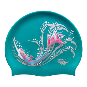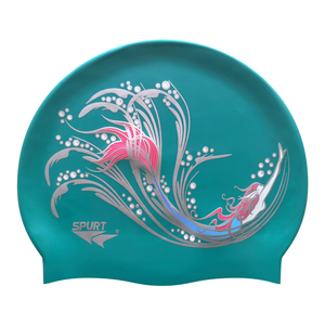 Sketched Mermaid in Swirls on SD24 Turquoise Green Spurt Silicone Swim Cap