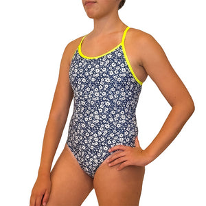 Kikx Extra Life Thin Strap Swimsuit in Ditzy Blooms in White on Dark Navy with Neon Yellow Straps