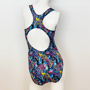Extra Life Fastback Swimsuit in Full Print Blue, Pink and Yellow Triangle