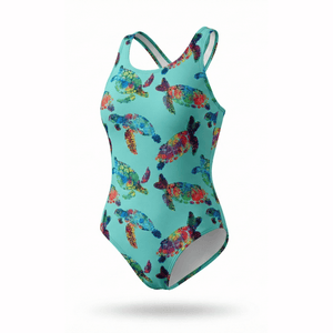 This full body fastback swimsuit for girls and ladies comes in a Turtle Tango design on teal and is made from Extra Life lycra to outlast ordinary lycra so you can love your costume even longer!